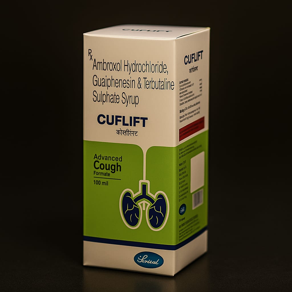 Cuflift Syrup is a cough and cold preparation commonly used to relieve respiratory symptoms associated with mucus build-up and airway obstruction. It usually contains a combination of a mucolytic (e.g., Ambroxol) to break down and thin mucus, an expectorant (e.g., Guaifenesin) to help expel mucus from the airways, and a bronchodilator (e.g., Terbutaline or Levosalbutamol) to relax the muscles of the airways, improving airflow. Some formulations may also contain soothing agents like Menthol to reduce throat irritation.