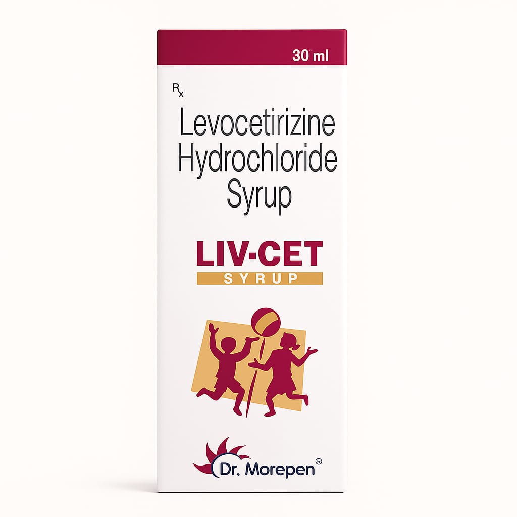 Liv-Cet Syrup 30 ml contains Levocetirizine, an antihistamine used to relieve symptoms of allergies. It works by blocking histamine, a chemical responsible for allergic reactions, thereby reducing itching, swelling, and other allergy-related symptoms. It is commonly prescribed for both seasonal and year-round allergies.