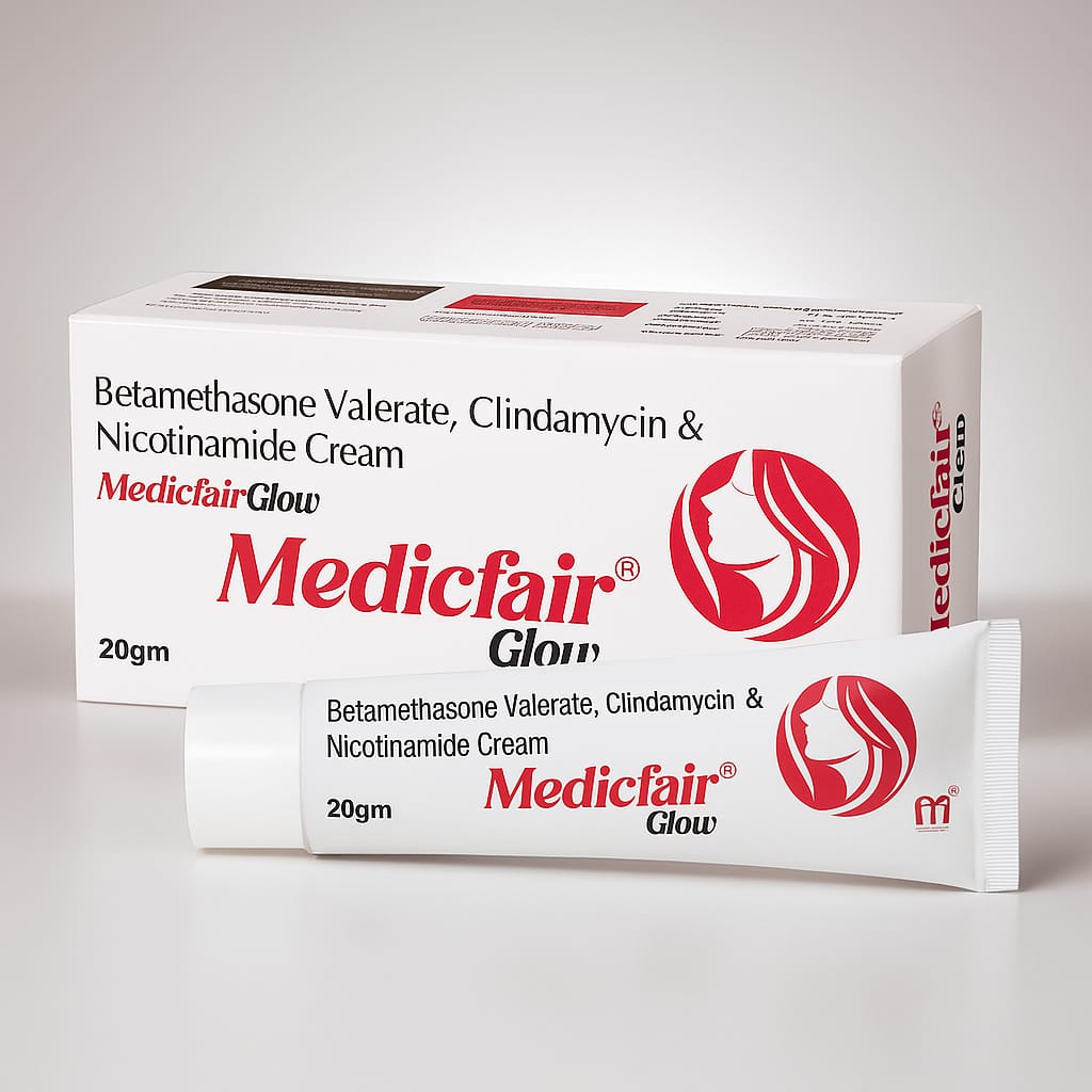 Medicfair Glow Ointment is a topical formulation generally used for improving skin texture, reducing pigmentation, and lightening dark spots. It may contain skin-lightening agents, mild steroids, and antioxidants depending on the formulation. It is often prescribed for conditions such as melasma, hyperpigmentation, post-inflammatory marks, and uneven skin tone. The ointment works by reducing melanin production, controlling inflammation, and promoting skin renewal. It is usually applied once or twice daily on the affected area as directed by a dermatologist.