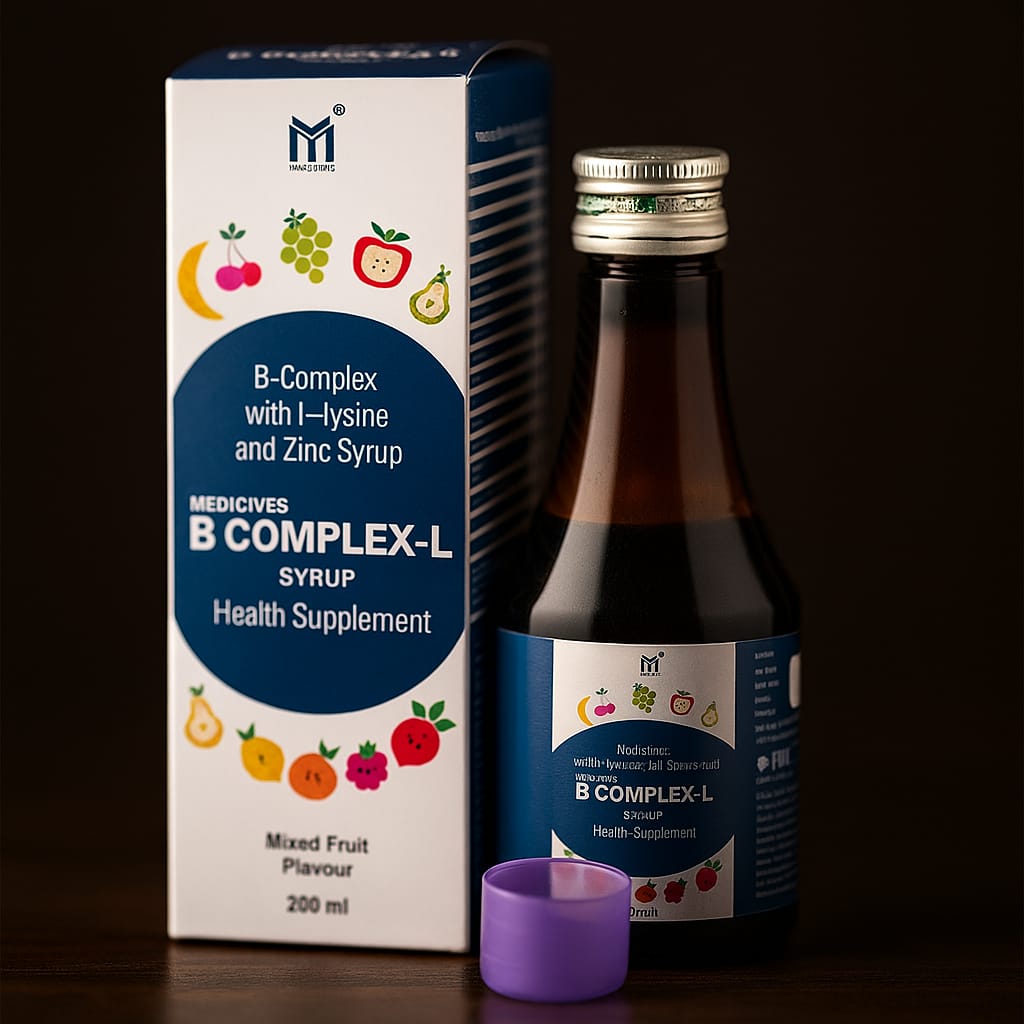 B Complex L Syrup is a multivitamin formulation containing various B vitamins and L-lysine. It is used to treat and prevent vitamin B complex deficiencies caused by poor diet, illness, or increased nutritional needs. It helps improve energy levels, supports nerve function, enhances metabolism, and aids in the production of red blood cells. L-lysine in the syrup promotes healthy growth, improves immunity, and supports tissue repair. It is often recommended for general weakness, fatigue, loss of appetite, and during recovery from illness or surgery.