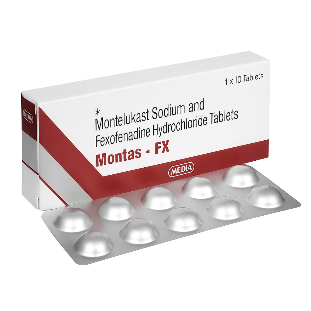 Montas FX is prescribed to relieve symptoms of allergic rhinitis (sneezing, runny nose, nasal congestion, watery eyes) and chronic urticaria (hives, itching). Montelukast works by blocking leukotrienes, chemicals responsible for allergic and inflammatory reactions, thus reducing swelling and mucus production. Fexofenadine is an antihistamine that blocks histamine receptors, preventing allergic symptoms like itching, redness, and watery eyes. The combination provides dual relief from both nasal and skin allergy symptoms. It is also used in some cases to manage seasonal allergies and mild asthma symptoms triggered by allergens.