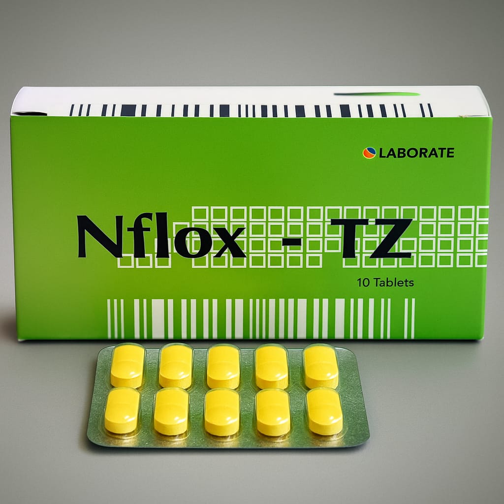 Nflox-TZ Tablet is a combination medicine containing Ofloxacin and Tinidazole, commonly used to treat various bacterial and protozoal infections. It is particularly effective against infections of the gastrointestinal tract, such as diarrhea, dysentery, typhoid fever, and certain urinary or gynecological infections. Ofloxacin is a fluoroquinolone antibiotic that works by inhibiting bacterial DNA replication, while Tinidazole is an antiprotozoal and antibacterial agent that disrupts DNA structure in parasites and anaerobic bacteria.