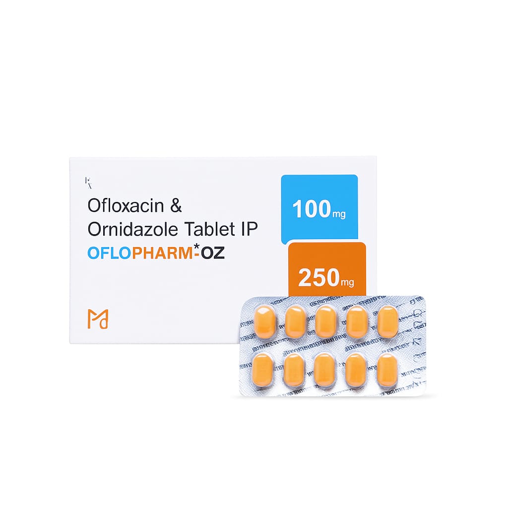 OFLOPHARMA OZ Tablet is a combination antibiotic containing Ofloxacin and Ornidazole. It is prescribed to treat a variety of bacterial and protozoal infections, particularly those involving the gastrointestinal tract, urinary tract, respiratory tract, and reproductive system. This medicine works by stopping the growth of bacteria (Ofloxacin) and killing protozoa or anaerobic bacteria (Ornidazole).
