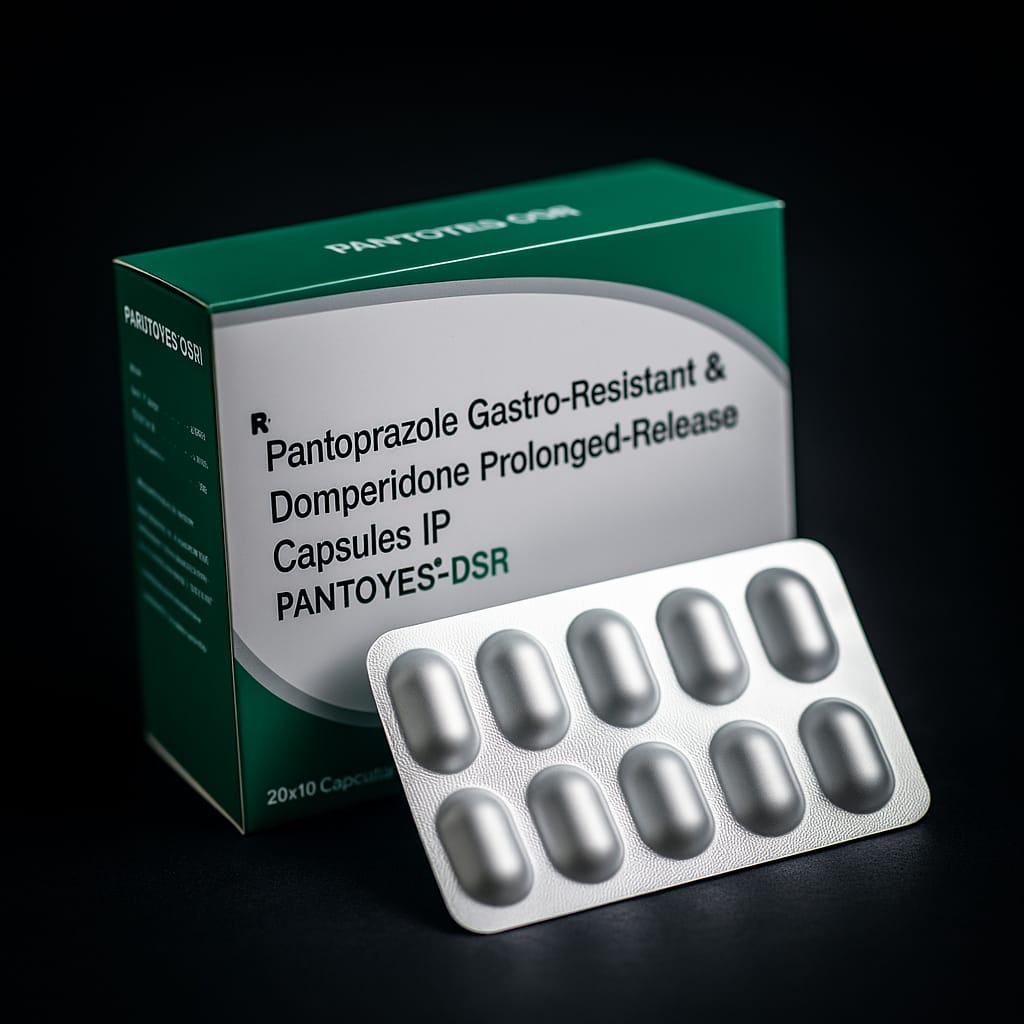 Pantoyes DSR Capsule is a combination medicine containing Pantoprazole (40 mg), a proton pump inhibitor, and Domperidone (30 mg SR), a prokinetic agent. It is mainly used to manage gastrointestinal conditions related to excess stomach acid and delayed gastric emptying.
