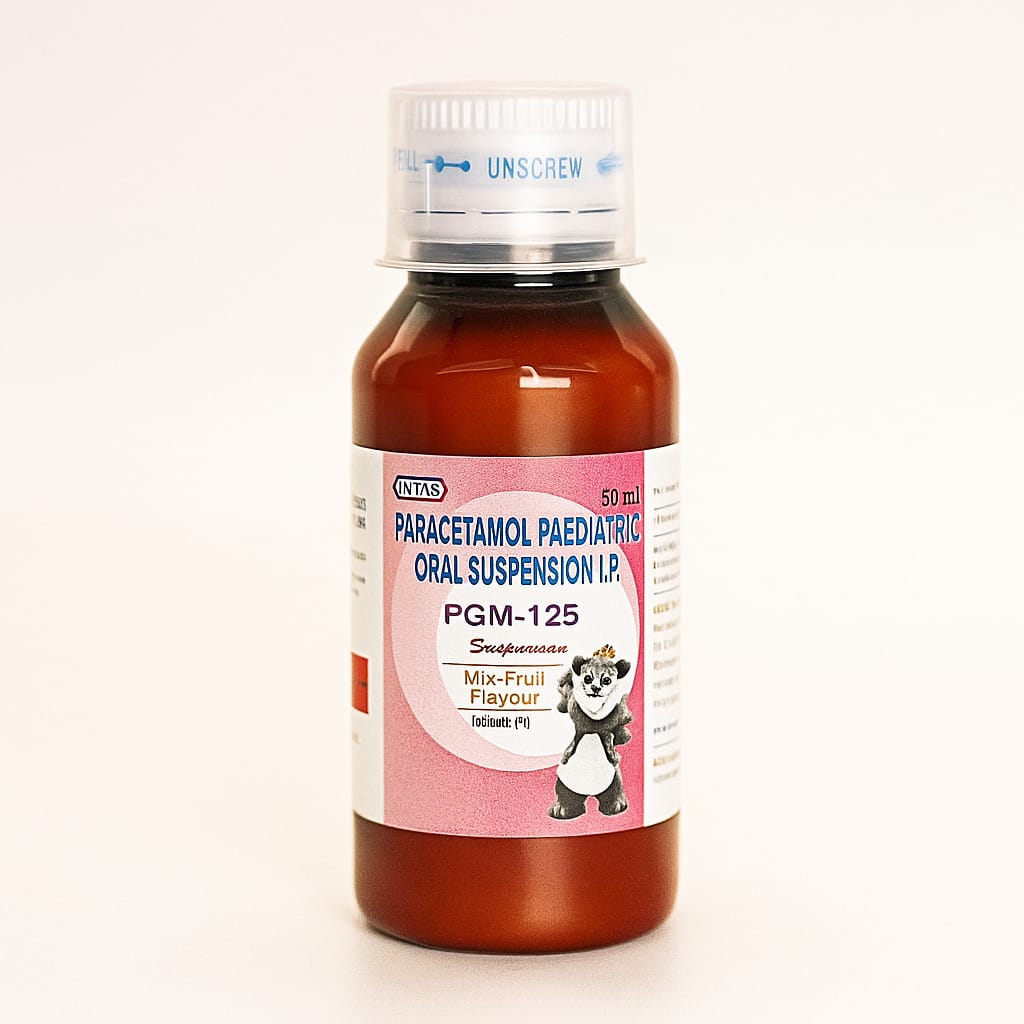 PCM 125 Suspension by Intas contains Paracetamol (125 mg per 5 ml), a commonly used analgesic (pain reliever) and antipyretic (fever reducer). It is mainly prescribed for infants and young children to treat fever, headaches, toothaches, common cold, sore throat, ear pain, and mild to moderate body pain.