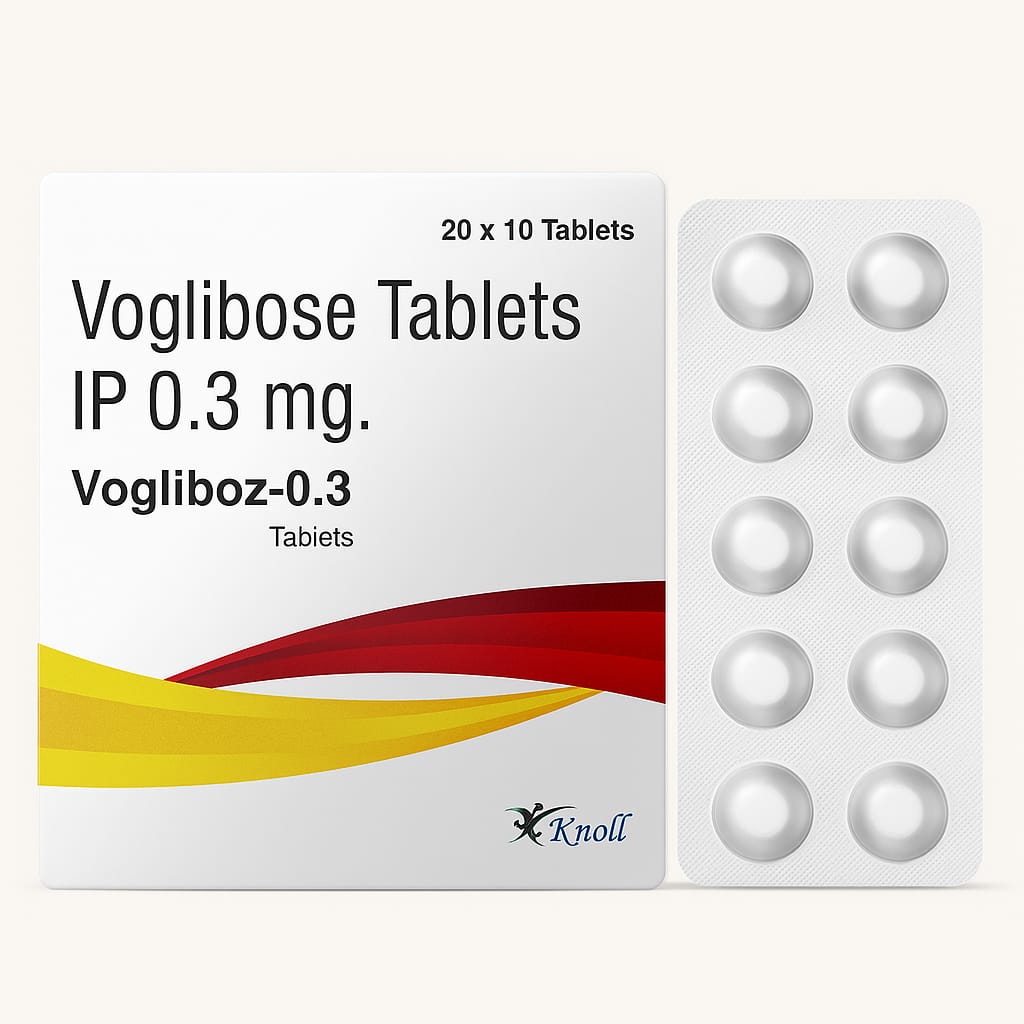 Vogliboz 0.3 Tablet contains Voglibose (0.3 mg), an anti-diabetic medicine used to control blood sugar levels in patients with Type 2 Diabetes Mellitus. It is particularly effective in managing postprandial hyperglycemia (high blood sugar after meals). Voglibose works by inhibiting intestinal enzymes (alpha-glucosidase) that break down complex carbohydrates into glucose, thereby slowing glucose absorption and preventing sudden spikes in blood sugar levels.
